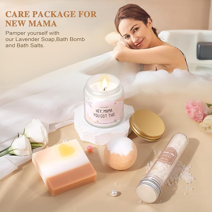 - 【Care Package for New Mama】Being a new mom can be both exciting and exhausting. After all the ups and downs, new mama need to be relaxed. Light a calming lavender-scented candle,sprinkle a handful of lavender bath salts and drop the bath bomb into the hot water, apply lavender soap on your body, serve your favorite drink in a glass for an at-home SPA experience.