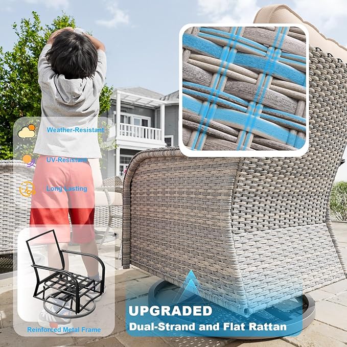 - 360Β° Swivel & Gentle Rocking:2 chairs perfectly combine the upgraded function of smooth rocking and full 360-degree swivel rotation. You can freely rotate in any direction and gently rock back and forth for a relaxing and cozy experience. Ideal for enjoying a coffee, reading, or chatting on your balcony, deck, or porch.