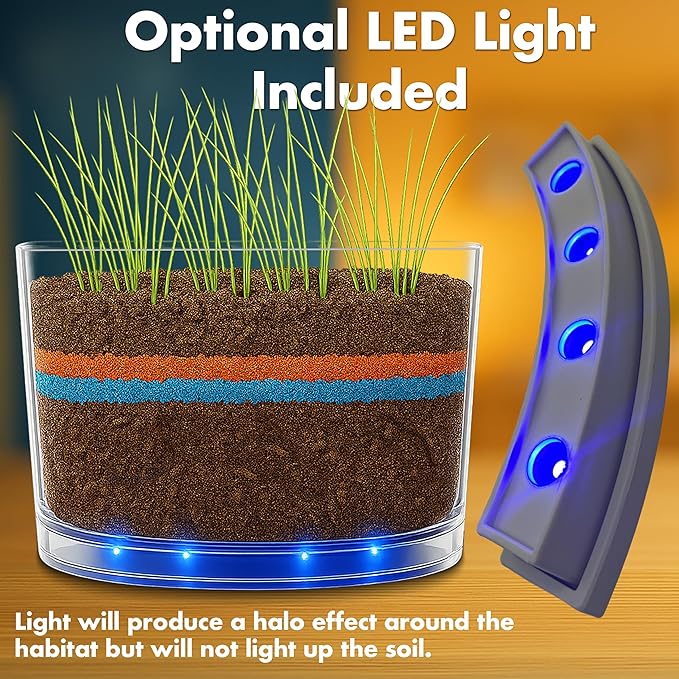 - OPTIONAL LED LIGHT FOR DISPLAY – The soft blue LED light creates a gentle halo effect around the habitat, enhancing its visual appeal. While it won’t illuminate the soil layers, it’s a great optional feature for display or low-light environments.