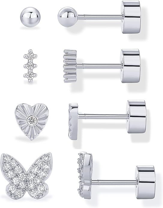 - HIGHLIGHTS: Create your perfect ear story with this trendy set featuring four pairs of earrings, including a minimalist 3mm ball stud, a sparkling 4.5mm long cubic zirconia stud, a charming 7.5mm wide butterfly stud, and a lovely 5.5mm heart stud. These dainty cartilage earrings for women have a comfortable screw back design that's so gentle you can even sleep in them, making them your go-to stacked earrings set for everyday wear from morning to night.