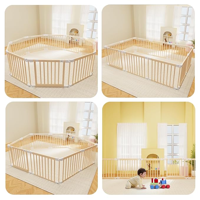 Baby Playpen, Foldable Wooden Play Yard with Gate, Playpen for Babies and Toddlers, Adjustable Baby Activity Center with Child Proof Lock, Fence Play Area for Toddlers 6 to 36 months(56*83*24inch)