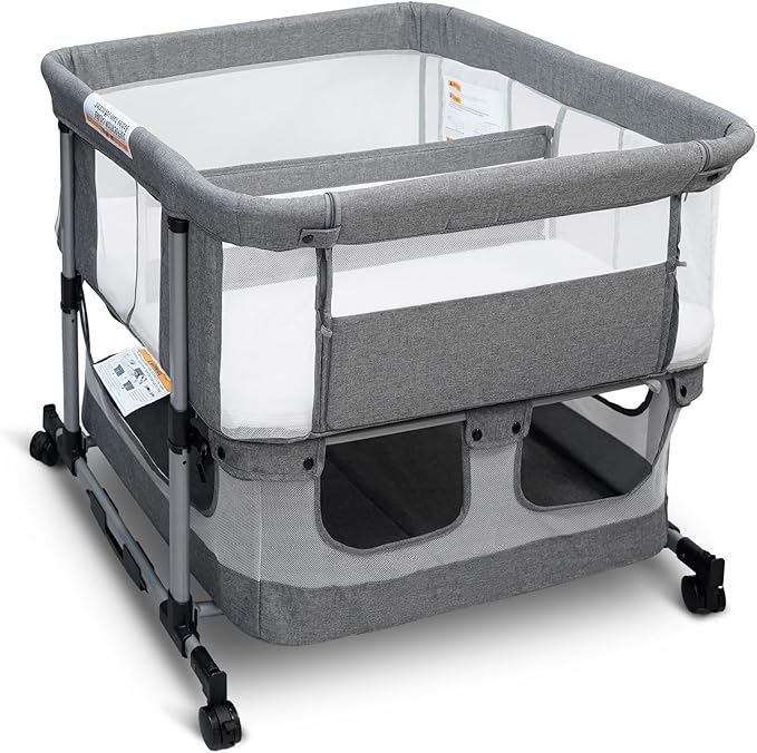 - Premium Quality with Storage basket: Built with a lightweight yet ultra-durable aluminum frame, this twin bassinet holds up to 45 lbs. The huge storage basket (25.6"L x 25.6"W x 9.8"H) keeps diapers, wipes, blankets, toys, and all baby essentials organized and within easy reach. Quality construction meets ultimate convenience!