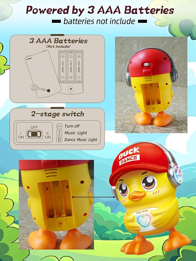 - Cute Dancing Duck:This adorable duck toy can dance, walk, sing, and wiggle with colorful lights and lively music. A fun and engaging light up baby toy that captures attention and keeps little ones entertained. Requires three 1.5V AAA batteries (not included)