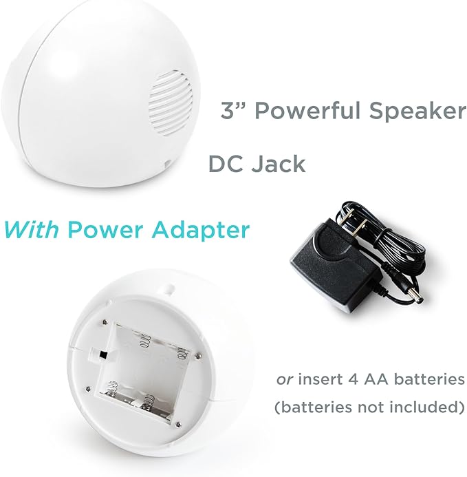 - [Light Weight, Compact size, a 3-inch Powerful Speaker, Easy to Use] a 3-inch 3W speaker boost steady sound, creates a 3D surround sound atmosphere. It perfectly blends in the background without notice. Plug-in outlet by included adapter or uses 4 AA batteries (not included), flexible accompany with you everywhere. 0.84 lbs, Dia. 5.5 x 4.6 inches. It is ideal for home, travel, the office, the car, yoga, leisure , lazy time and a flexible work environment
