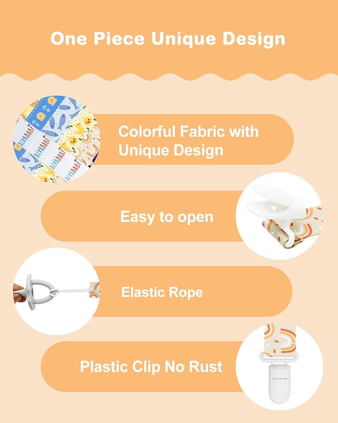 - Material-ALVABABY baby pacifier leash are made of polyester fabric,plastic clip,nylon rope.Paci clip strap is a universal pacifier leash designed with a loop to be compatible with all types of pacifiers,suitable for babies of all ages that newborn,infants,toddler.Pacifier holder clip helps a crawling baby keep their pacifier from dragging on the dirty ground.