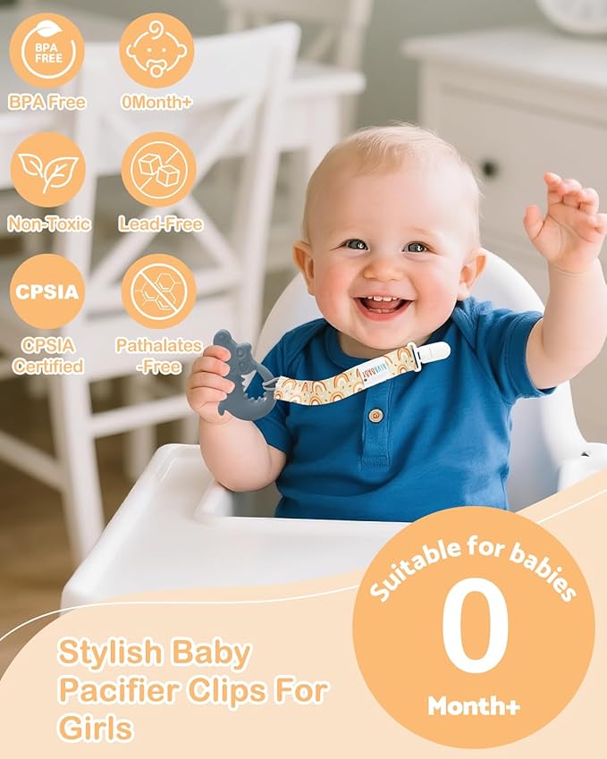 - Safety-Pacifier clips with plastic teeth hold tight and will hardly damage baby's clothes or discomfort the baby,but please do not let your baby chew on the clips to avoid a choking hazard.They are BPA free,phthalate free,latex free,lead free and CPSIA certified,pacifier clip holder are washable,durable and soft.