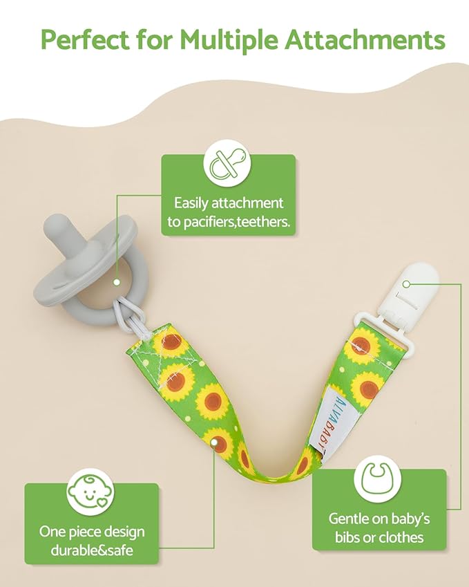 - Multifunctional Usage: pacifier leashes are usually used for any pacifiers,soothies,burp cloths,teether toys,teething rings,Nuks,MAMs,baby blankets,baby drool bibs,strollers,play gyms and car seats.It is an universal pacifier clip and fits to your favorite brand of pacifier and soother.Pacifier clip holder would be hold on the clothes firmly without damaging baby's clothes.Never lose or drop the pacifier.
