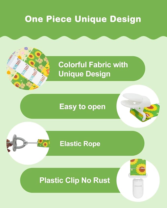 - Material-ALVABABY baby pacifier leash are made of polyester fabric,plastic clip,nylon rope.Paci clip strap is a universal pacifier leash designed with a loop to be compatible with all types of pacifiers,suitable for babies of all ages that newborn,infants,toddler.Pacifier holder clip helps a crawling baby keep their pacifier from dragging on the dirty ground.