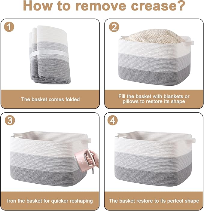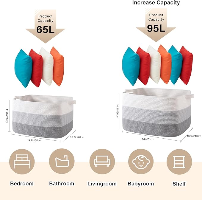 65L Large Storage Basket, Cotton Rope Woven Blanket Basket, Toy Storage for Baby Room, Living Room, Gradient Grey