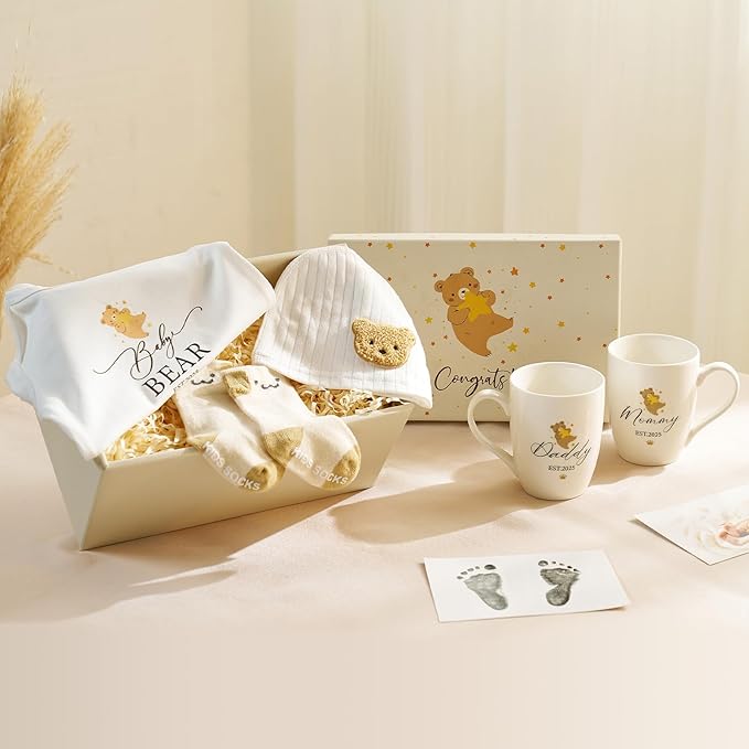 - New Baby Gift Basket: Adorable bear-themed gender reveal gift set, package include a 0-3M unisex onesie, 1 pairs of cute socks, a unisex baby bear hat, set of 2 mom and dad coffee mugs! Suitable for gender reveal, baby showers, pregnancy announcements or new mom care package after baby