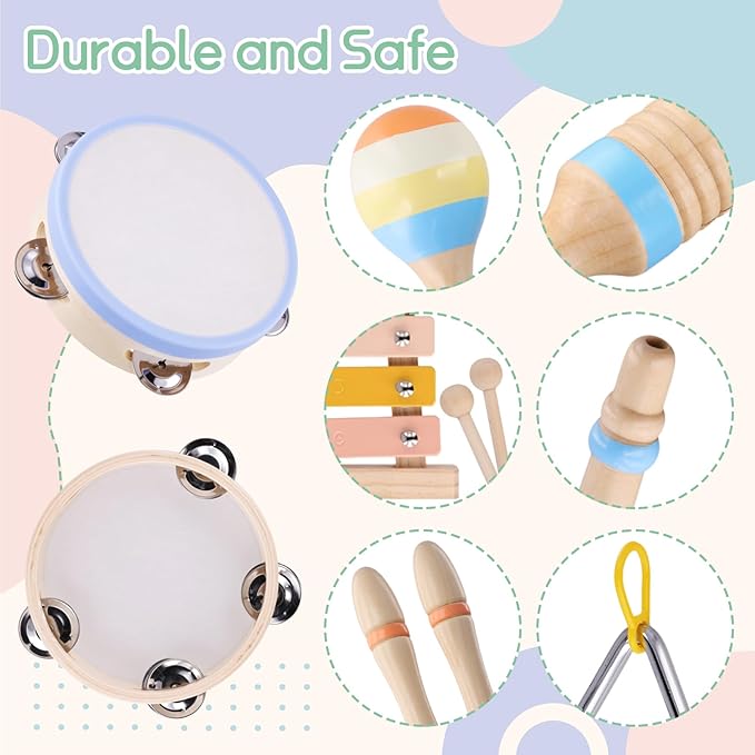 - Toddler Musical Instruments Set: Includes xylophone, tambourine, triangle, clarinet, hand bell, wood sounder, and 2 maracas. This complete baby music set is designed to introduce young children to sound, rhythm, and music in a fun and interactive way."