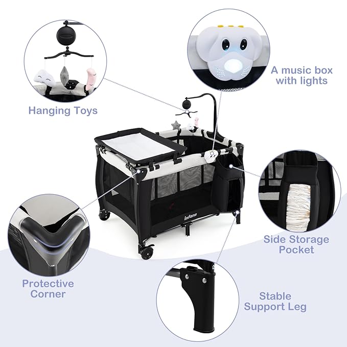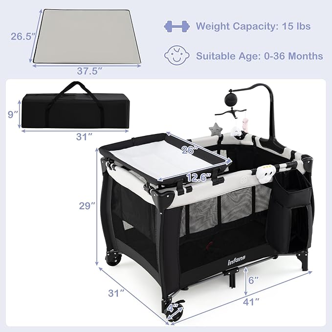 - Multi-functional Baby Crib: The 3-in-1 infant crib can be used as a playpen, bassinet and changing table. The crib comes with a side bag for diaper. The versatile design provides convenience and practicality for parents, while the kids playpen accompanies your babyโs growth. (Suitable Mattress Pad's Size: 37.5โL x 26.5โW)