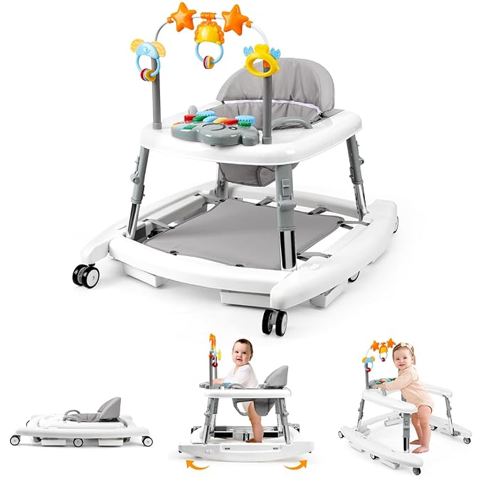 - [5-in-1 Baby Walker Design] : The baby walker has five modes: baby walker mode, bouncing combination mode, rocking chair mode, dining table mode, and hand push mode. Baby walkers meet the exploration and growth needs of infants at various stages from 6 months to 18 months, and do not require complicated installation steps. Moreover, in the pushing mode of the baby walker, the directional wheels can be used, which can increase or decrease the movement speed of the wheels.