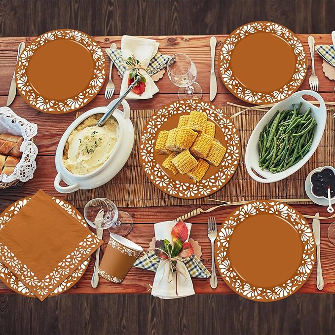 - package includes: our 144pcs cielito lindo party decoration includes 24pcs 9-inch dinner platos de barro mexicanos plates and 24pcs 7-inch dessert mexican paper plates, 24pcs barro themed party decorations knifves and fork each set can serve 24 guests. the mexican paper plates are ideal for creating a celebratory atmosphere and making your event memorable. this set of white flower disposable terracotta plates and brown toile napkins will add amazing to you, your family and friends