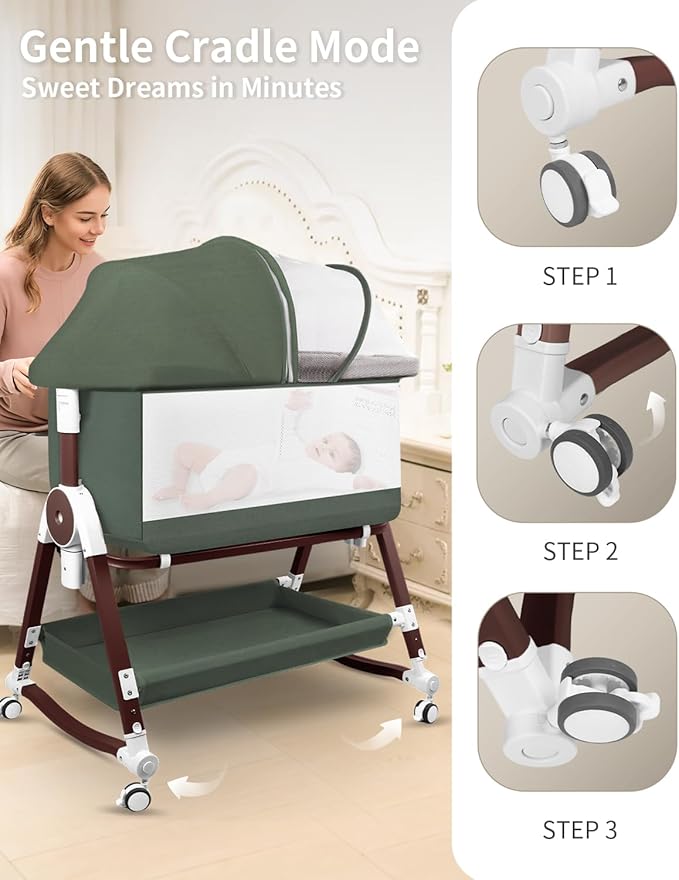 - Multifunctinal Baby Bassinet: Bassinet Bedside Sleeper can be converted into 4 modes. Such as a Cradle, Bedside crib, portable baby bassinet with wheels, and baby crib with a mosquito net.The baby bassinet can be used in different scenarios with different modes to meet the various needs of you and your baby