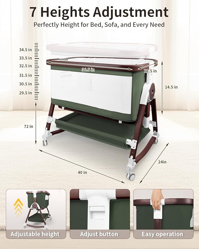 - 7 Level Height Adjustment: Ensuring the co sleeper bassinet can fits most bed heights, we specially designed the adjustable height feature. Before feeding your baby, you can adjust the adjustable bedside bassinet to the suitable Angle to prevent your baby from reflux