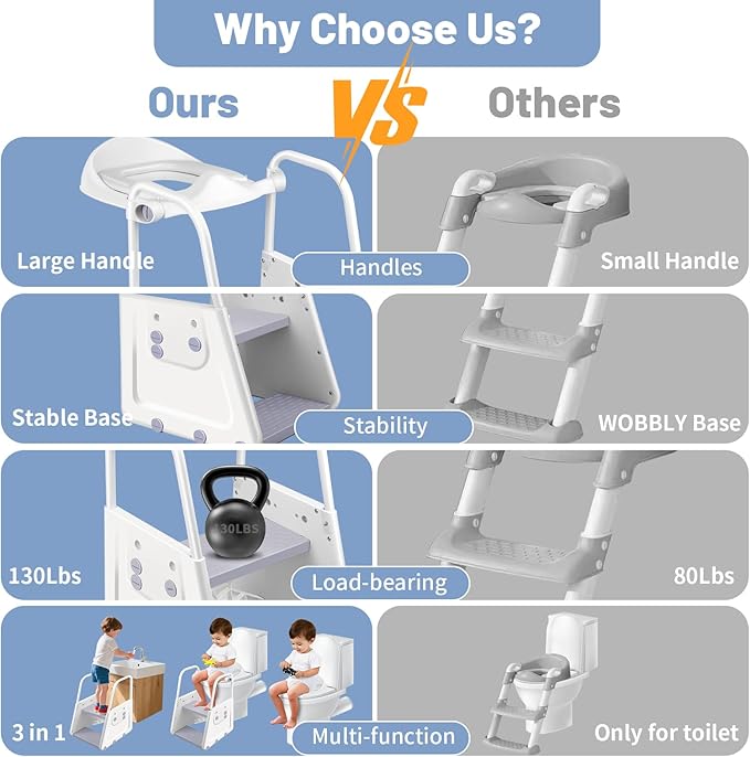 - 【3 in 1 Multiple Uses】Are you tired of buying separate stools for bathroom, kitchen and toilet? Spluvvly 3-in-1 potty traing seat eliminates clutter while meet your child's needs. Not only to help toddlers with potty training, but also used in more occasions, genuinely fostering children independence.