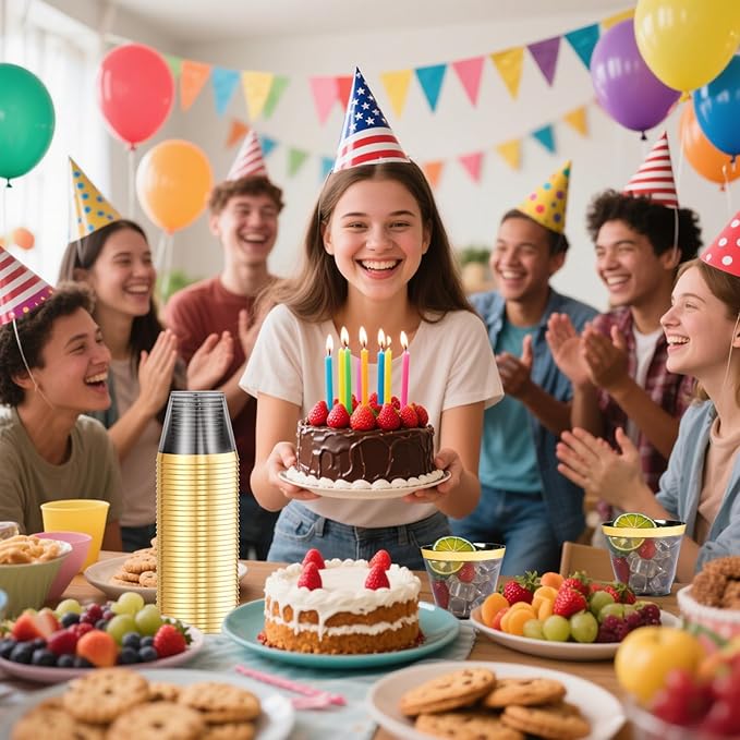 supernal 200 Pcs Gold and Black Plastic Cups,9Oz Gold Rimmed Disposable Cups,Heavy-Duty Plastic Cocktail Glasses for Party,Fancy Party Cups,Perfect for Christmas,Holiday,Birthday Party Events