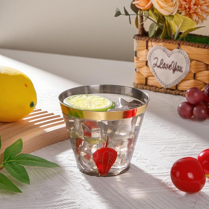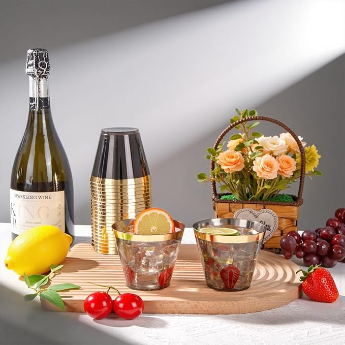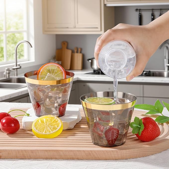 - Elegant Design:The disposable cups have fair gold rim,using these gold plastic cups at party is the ultimate treat,making your party decoration more glamorous and your drinks looking more appetizing.