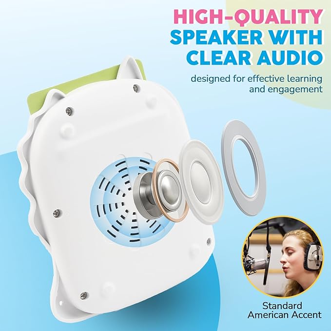 - [Effortless Operation] Using the device is simple: turn it on, insert a card, and hear the words spoken in a clear American accent. The reader also replicates real animal sounds, includes a repeat button for reinforcement, and offers 8 adjustable volume levels. A beep sound indicates the highest volume setting, ensuring easy control.