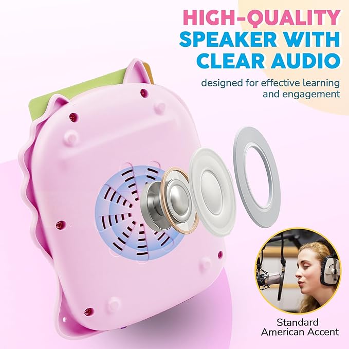 - [Effortless Operation] Using the device is simple: turn it on, insert a card, and hear the words spoken in a clear American accent. The reader also replicates real animal sounds, includes a repeat button for reinforcement, and offers 8 adjustable volume levels. A beep sound indicates the highest volume setting, ensuring easy control.