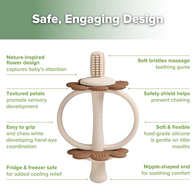 - ππππ-πππππ ππππππ πππ πππππππ:With a nipple-shaped end for comfort and 360Β° bristles for gum massage, this teether provides teething relief and help supports oral hygiene.