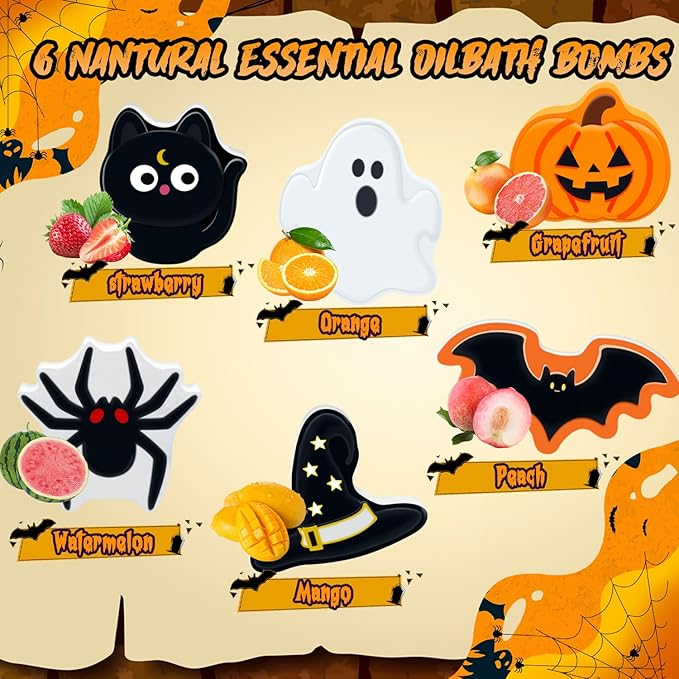 - Halloween Bath Bombs Gift Set:The features 6 whimsical shapes - pumpkin, ghost, witch hat, bat, black cat, and spider - each designed to spark festive fun and holiday cheer during bath time. Perfect for adding a touch of Halloween charm to your self-care routine or a child’s bath, these kids-friendly bath bombs celebrate the spooky season with every fizz.