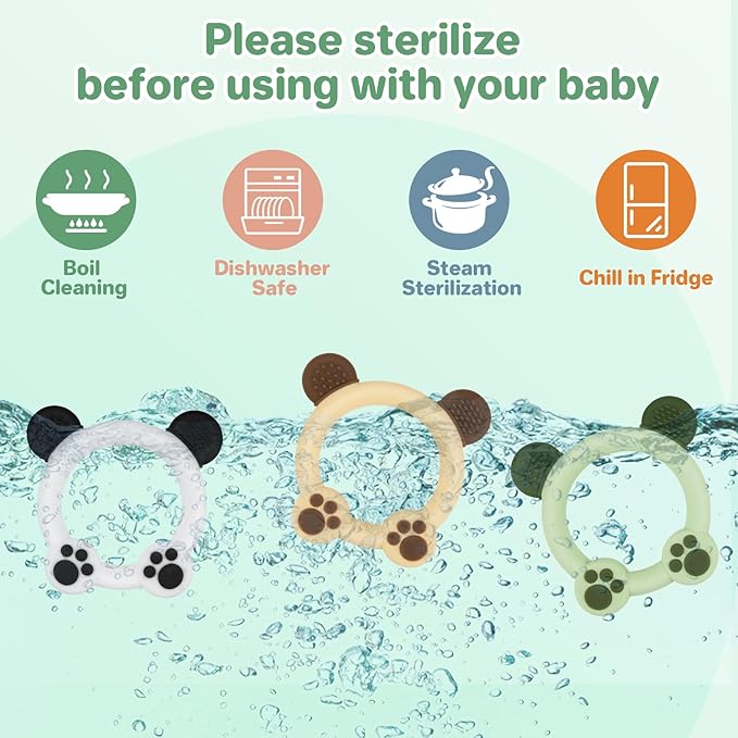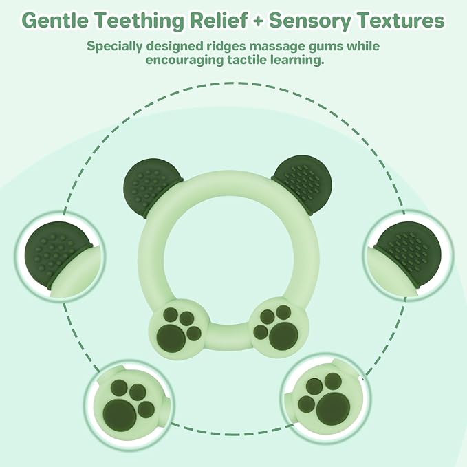 - 1.Cute 3-Color Panda Design: This set includes three charming panda-head teethers in vibrant colors, sparking baby’s visual curiosity and encouraging grasping play.