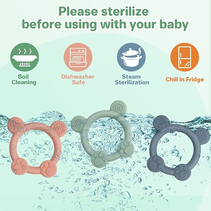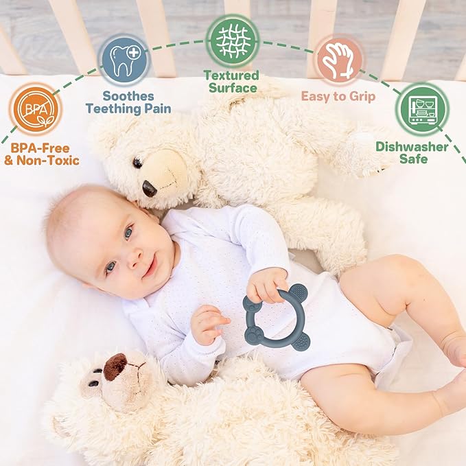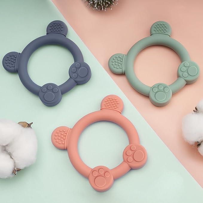 3 Pack Baby Teether, Bear-Shaped Silicone Teething Toys for Infants 0-24 Months, BPA-Free Chew Toys to Soothe Sore Gums (Pale Pink & Green & Blue)