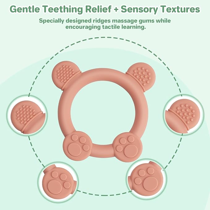 - 3.Soothes Teething Discomfort: Designed for 0-24 months, its textured surfaces provide comforting gum massage, easing pain, swelling, and fussiness during teething.