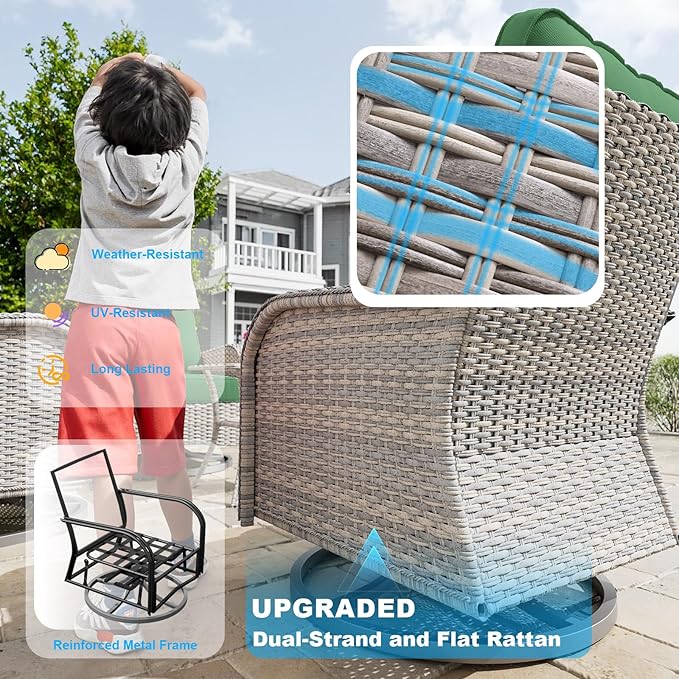 - 360Β° Swivel & Gentle Rocking:2 chairs perfectly combine the upgraded function of smooth rocking and full 360-degree swivel rotation. You can freely rotate in any direction and gently rock back and forth for a relaxing and cozy experience. Ideal for enjoying a coffee, reading, or chatting on your balcony, deck, or porch.