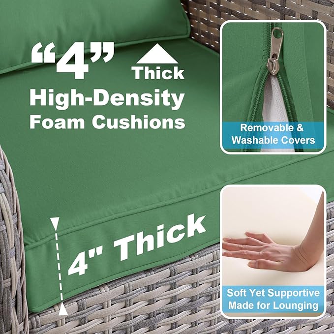 - Upgraded Cushions:Features upgraded 4-inch thick seat and back cushions made of high-resilience sponge, wrapped in fade-resistant polyester fabric. The detachable cushion covers are splash-resistant and easy to remove for cleaning. The ergonomic backrest and wide seat offer all-day lounging comfort.