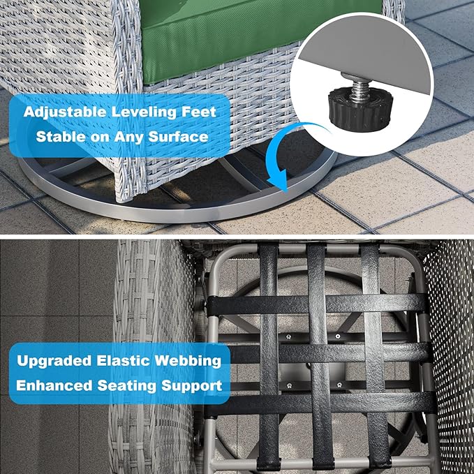 - Adjustable Leveling Feet:No more wobbling! Equipped with adjustable leveling feet on each base, these outdoor swivel chairs stay balanced even on uneven floors like tiles or wood decking. The sturdy circular base also provides enhanced stability during rocking and spinning.