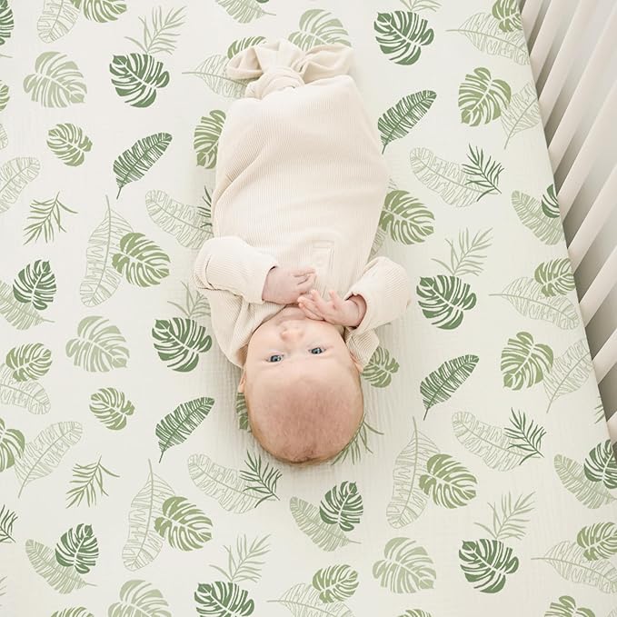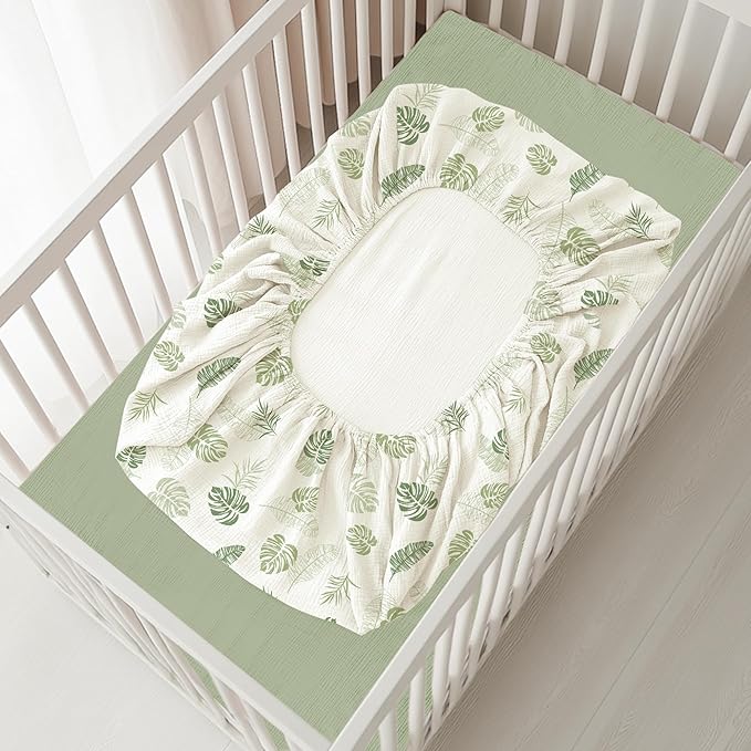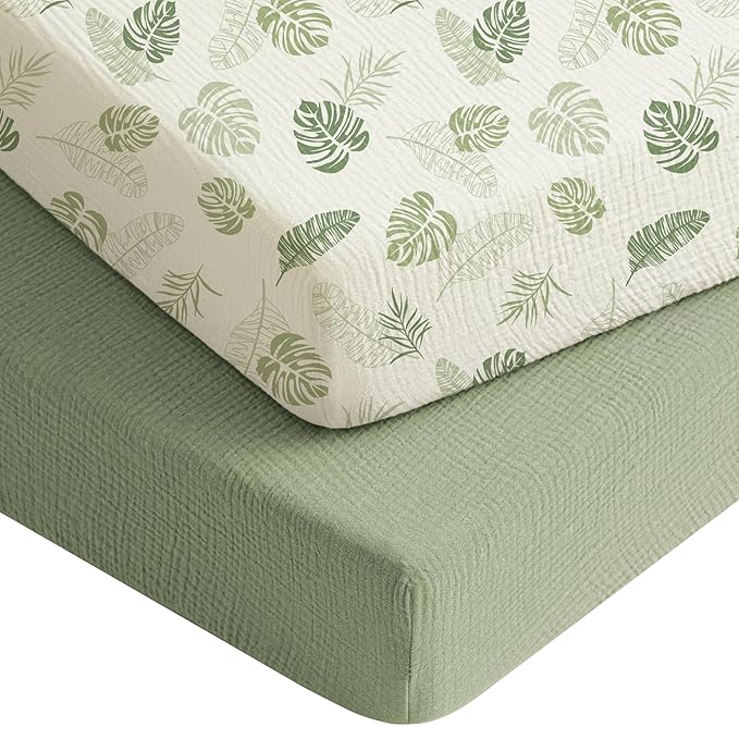 Konssy Muslin Crib Sheets for Boys, Soft Cotton Neutral Baby Sheets for Standard Crib Mattress 2 Pack, 52"x28" (Palm Paradise,Sage)