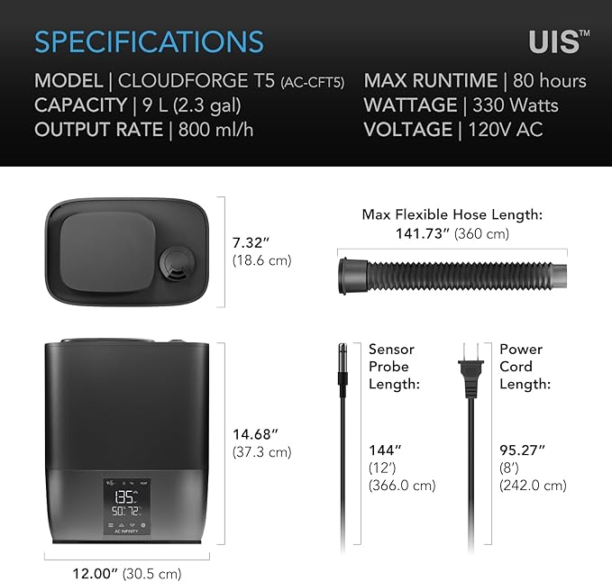 AC Infinity CLOUDFORGE T5, Warm Mist Plant Humidifier 9L with VPD Humidity 10-Level Controls, Hot/Cold Vaporizer for All Climates, Continuous Water Purifying, Extendable Targeted Hose for Grow Tents