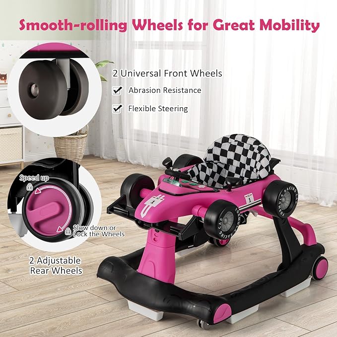 HONEY JOY 4-in-1 Baby Walker, Activity Push Walker w/3 Adjustable Heights, Smooth Wheels w/Adjustable Speed, Padded Seat, Music & Light, Foldable Car Walker for Baby Boys Girls Age 6 Months+ (Pink)