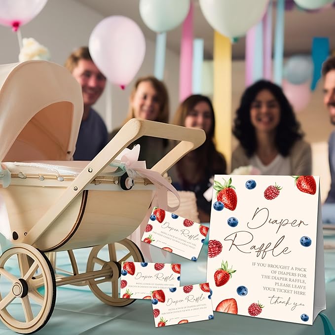 Blueberry & Strawberry Diaper Raffle Set For Baby Shower - 50 Raffle Tickets With 1 Standing Sign - Baby Announcement, Gender Reveal Baby Shower Party Decoration Game Set - A06