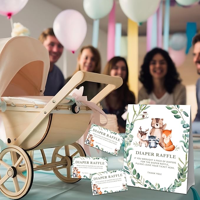 Greenery Animals Diaper Raffle Set For Baby Shower - 50 Raffle Tickets With 1 Standing Sign - Baby Announcement, Gender Reveal Baby Shower Party Decoration Game Set - A04