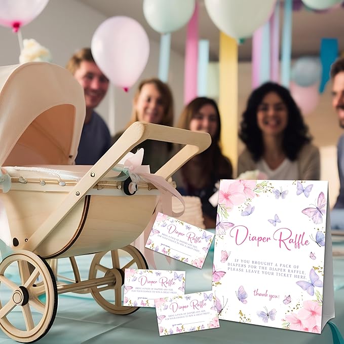 Watercolor Butterfly Diaper Raffle Set For Baby Shower - 50 Raffle Tickets With 1 Standing Sign - Baby Announcement, Gender Reveal Baby Shower Party Decoration Game Set - A03