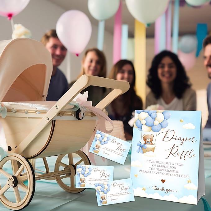 Blue Teddy Bear Diaper Raffle Set For Baby Shower - 50 Raffle Tickets With 1 Standing Sign - Baby Announcement, Gender Reveal Baby Shower Party Decoration Game Set - A01