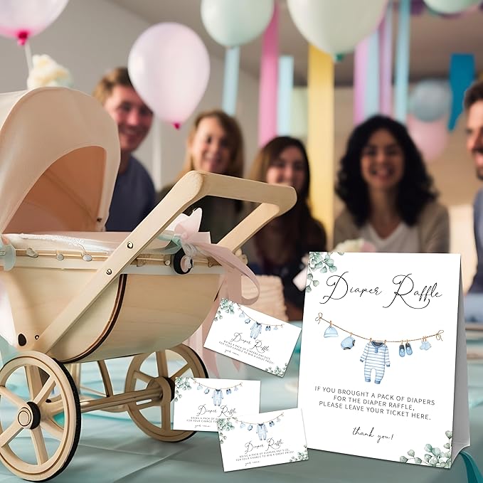 - Size: The standing sign is 5 x 7 inches, and the diaper raffle tickets size is 2.1 x 3.5 inches.