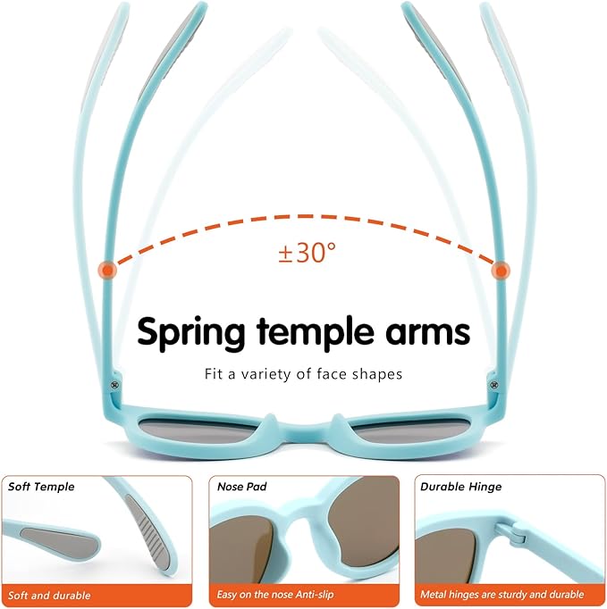 • Durable Design: Our sunglasses for kids are built with premium, impact-resistant TPEE rubber materials, these shatterproof toddler sunglasses are designed to withstand the rough and tumble of kids’ daily adventures, ensuring long-lasting use.
