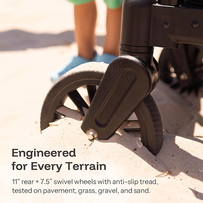 - Push & Pull Mode with All-Terrain Wheels: Adjustable PU leather handlebar fits parents of different heights, while the lockable 2-section pull handle allows smooth switch between push & pull. Equipped with 11" rear wheels, 7.5" swivel front wheels, and EVA all-terrain tires for any adventure