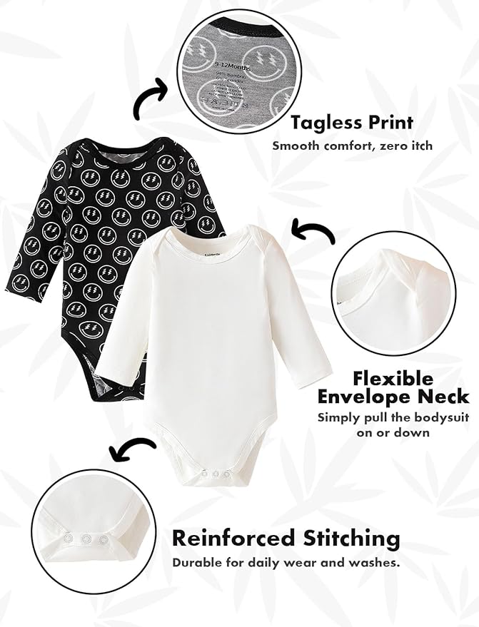 - More breathable and baby-friendly material- 94% Rayon Derived from Bamboo, 6% Spandex.Our newborn onsies unisex are soft and comfy for fall winter fun with baby.