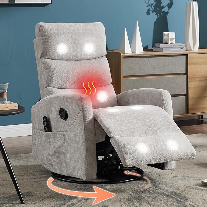 Manual Swivel Rocker Recliner Chair with Massage, Overstuffed Recliner Glider with Vibration Massage and Heat for Nursery, Living Room Reclining Sofa Chair, Fabric Light Gray