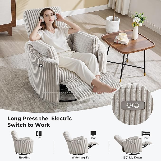 Recliner Swivel Glider Electric Rocking Chair with USB Living Room Bedroom Upholstered Highback Nursery Adult Power Recliner Rocking Chair with 2 Pillows(LIGHTGREY Corduroy, Power-Driven)