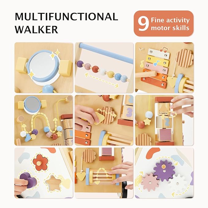 - Multifunctional fun: 10-in-1 Activity Center for babies, Equipped with an interactive panel featuring a mirror, spinning gears, and beads track, xylophone, shapes sorter, rblocks, soundable roller, counting beads, flip-flop learning toys. Helps toddlers develop color perception while they walk. Includes a rear rack for adding favorite toys, fostering a sense of companionship.
