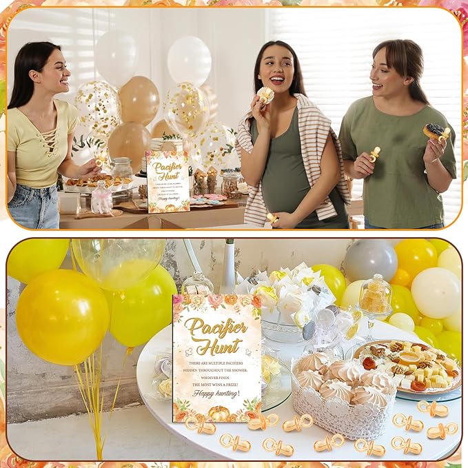 Thyle 51 Pcs Pacifier Hunt Baby Shower Games Include Hunt Sign and 50 Acrylic Pacifiers for Baby Shower Game Decoration Gift Sets Gender Reveal Party Decor (Watercolor Pumpkin)