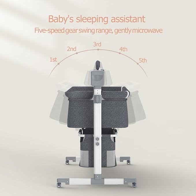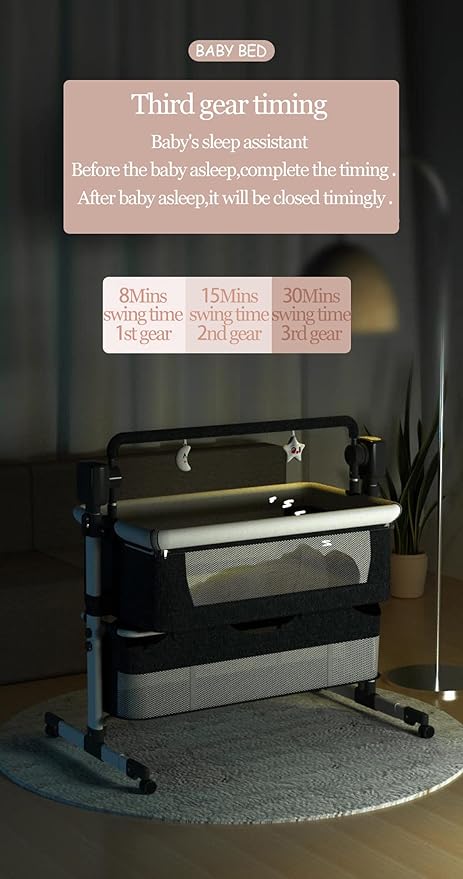 - 【Three multifunctional timing modes and adjustable five speed swing】This Co sleeper cradle cots offers three timing modes -8, 15, and 30 minutes - which are highly flexible and user-friendly, providing parents with the flexibility and diversity to set stop times according to their preferences. This Co sleeper cradle cots has five swing, each with a different swing amplitude. Mothers can design the most suitable swing floating gear according to the baby's sleeping preferences.