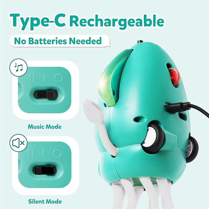 - RECHARGEABLE & AUTO OBSTACLE: Includes a quiet mode (music off) and is Type-C rechargeable. This electric crawling octopus toy has a built-in intelligent sensor to detect and bypass obstacles, helping it stay safe and keep the fun going. It automatically turns and changes direction to attract children's attention and encourage them to crawl along
